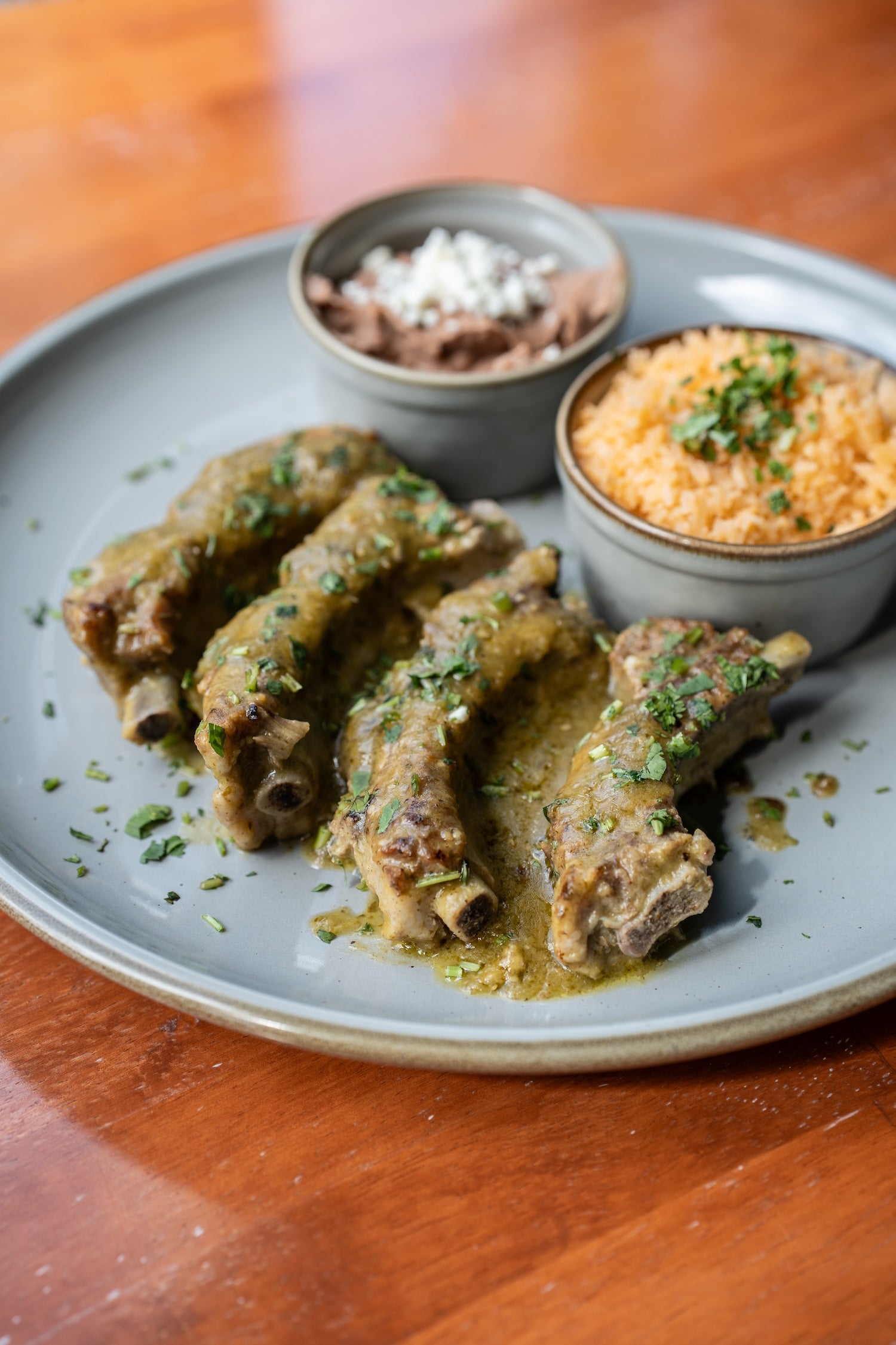 Pork ribs in tomatillo green sauce, Mexican rice, refried pork beans, guacamole