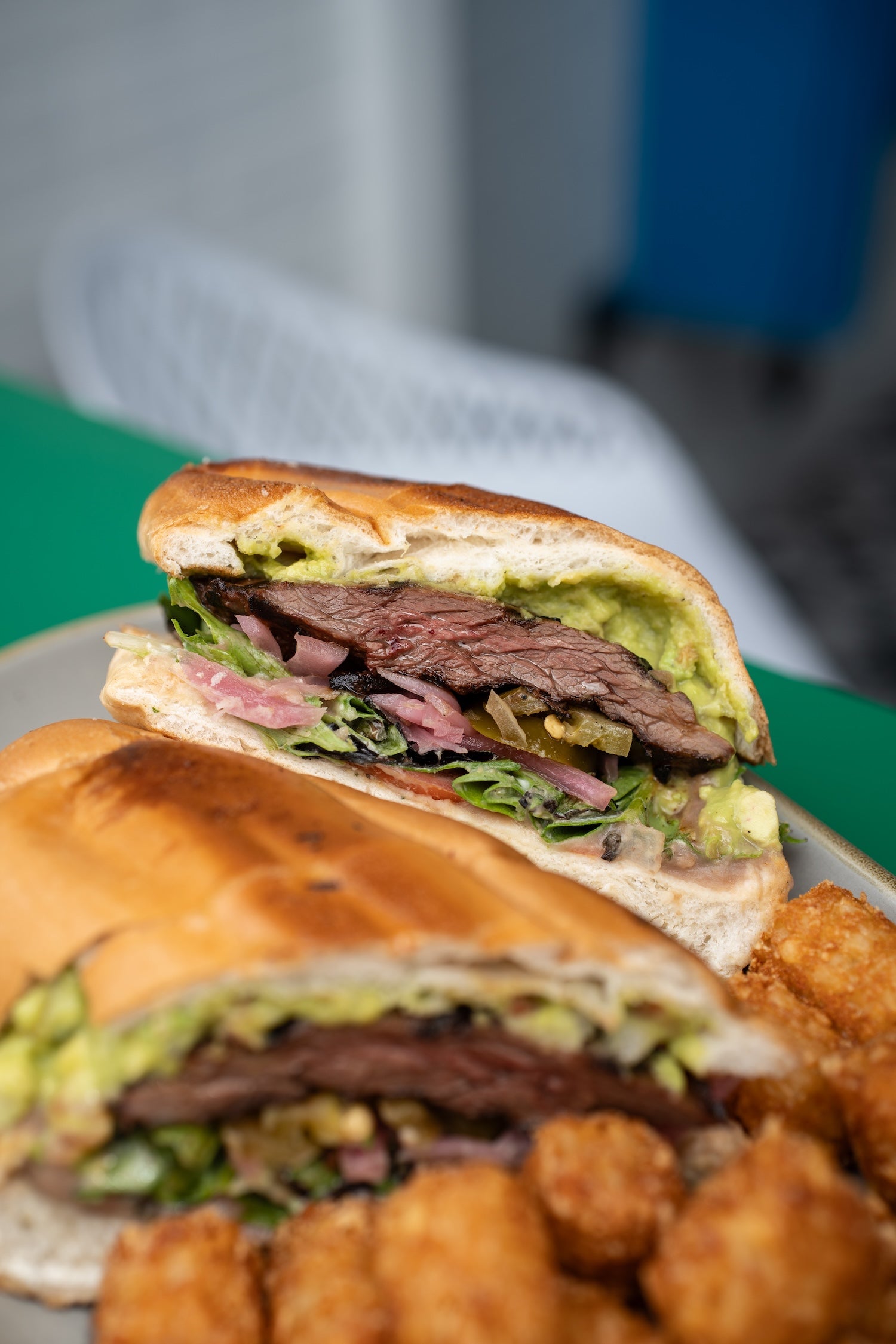 Mexican steak sandwich, refried pork beans, guacamole, tomato, spring mix, habanero mayo