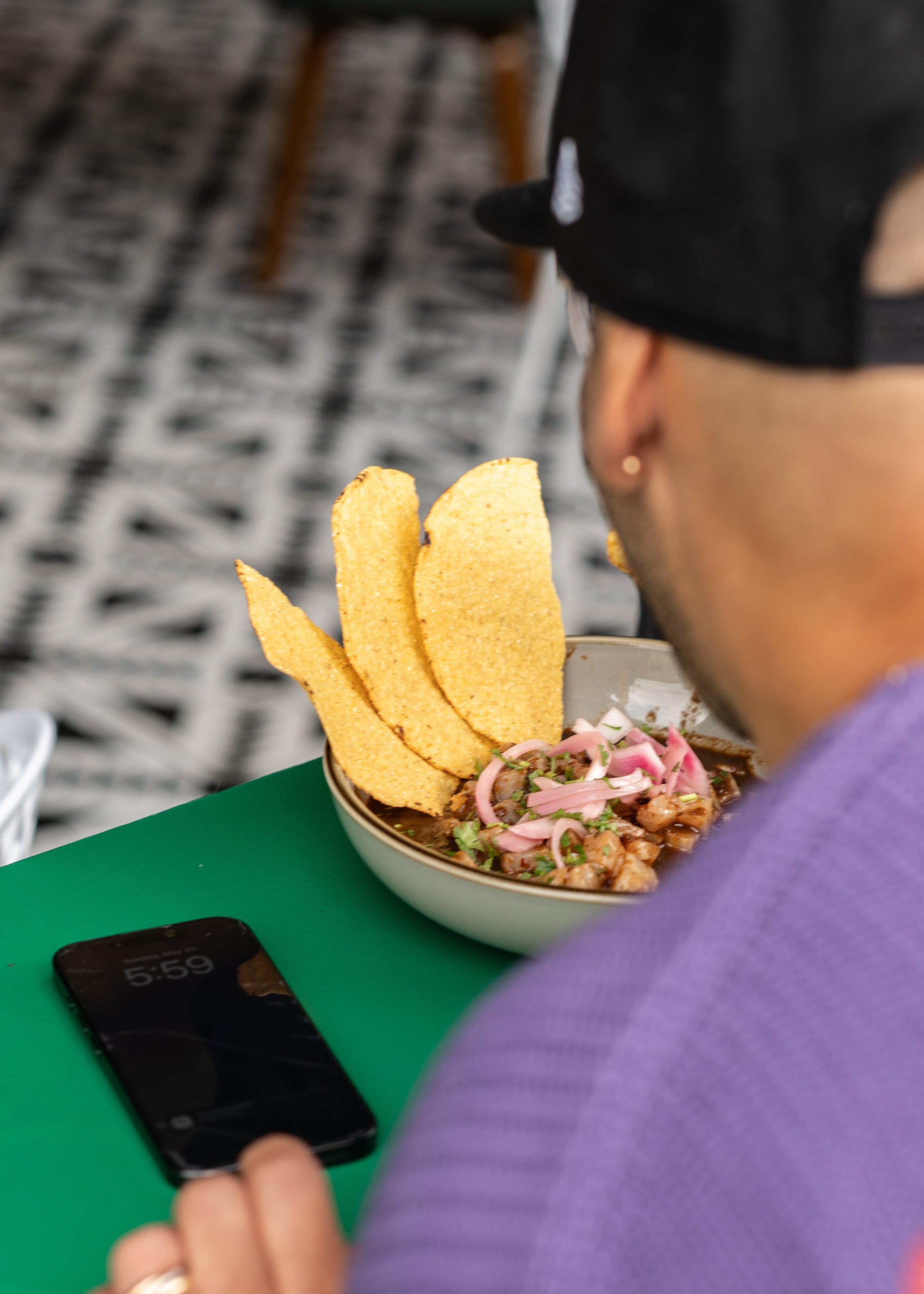 Shrimp, black chili sauce, toasted corn tostada