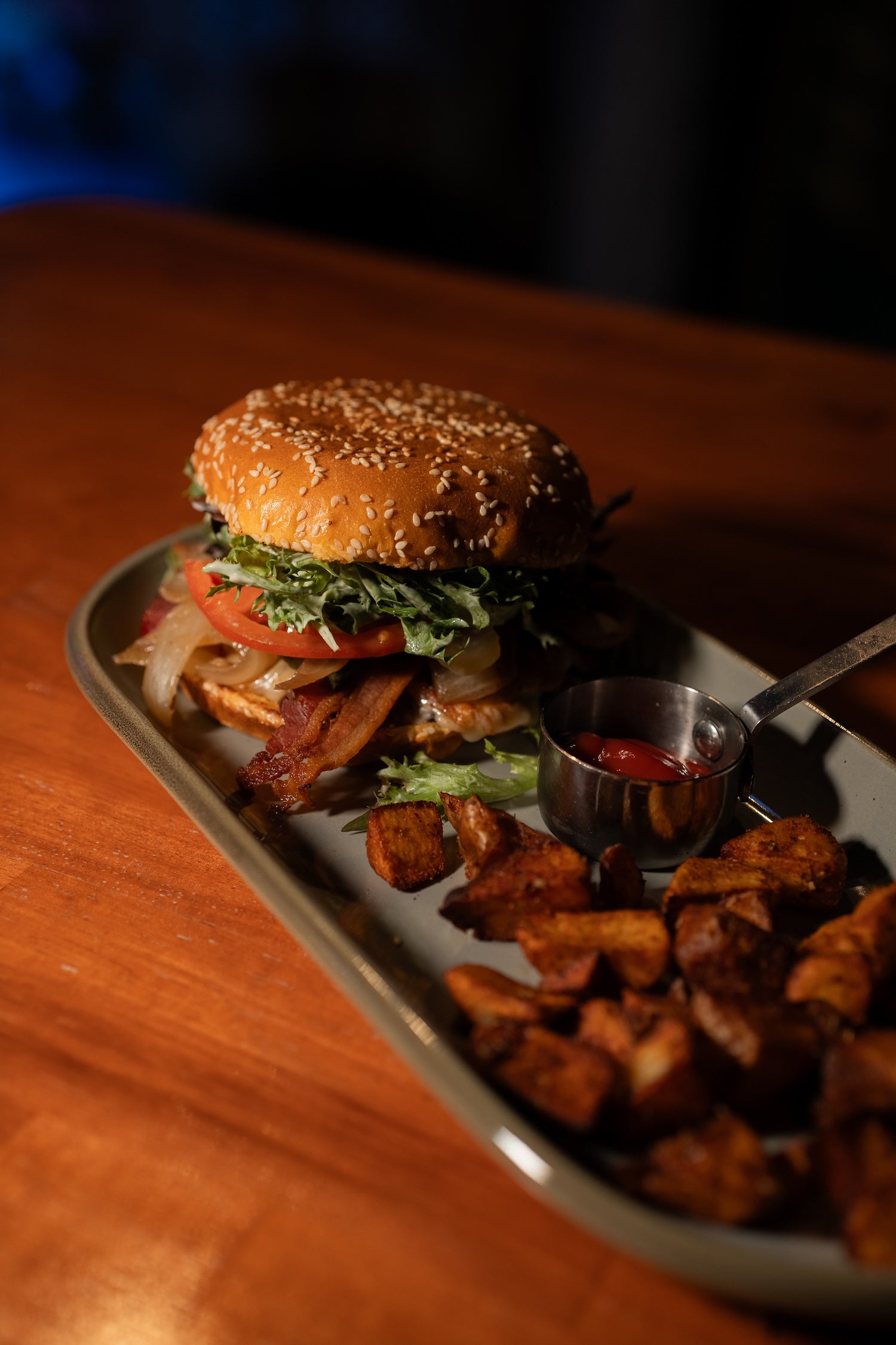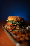 Angus patty, onion, jalapeño, mayo chipotle, tomato, bacon, spring mix with rustic potatoes.